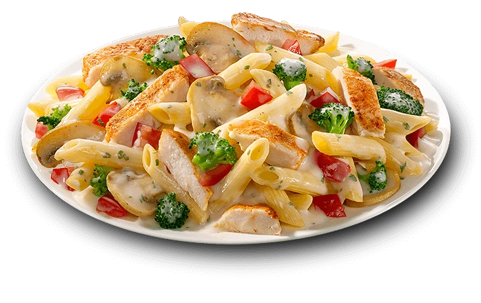 Creamy Garlic Sauce, Mushrooms, Chicken, Bacon, Mozzarella Tomato